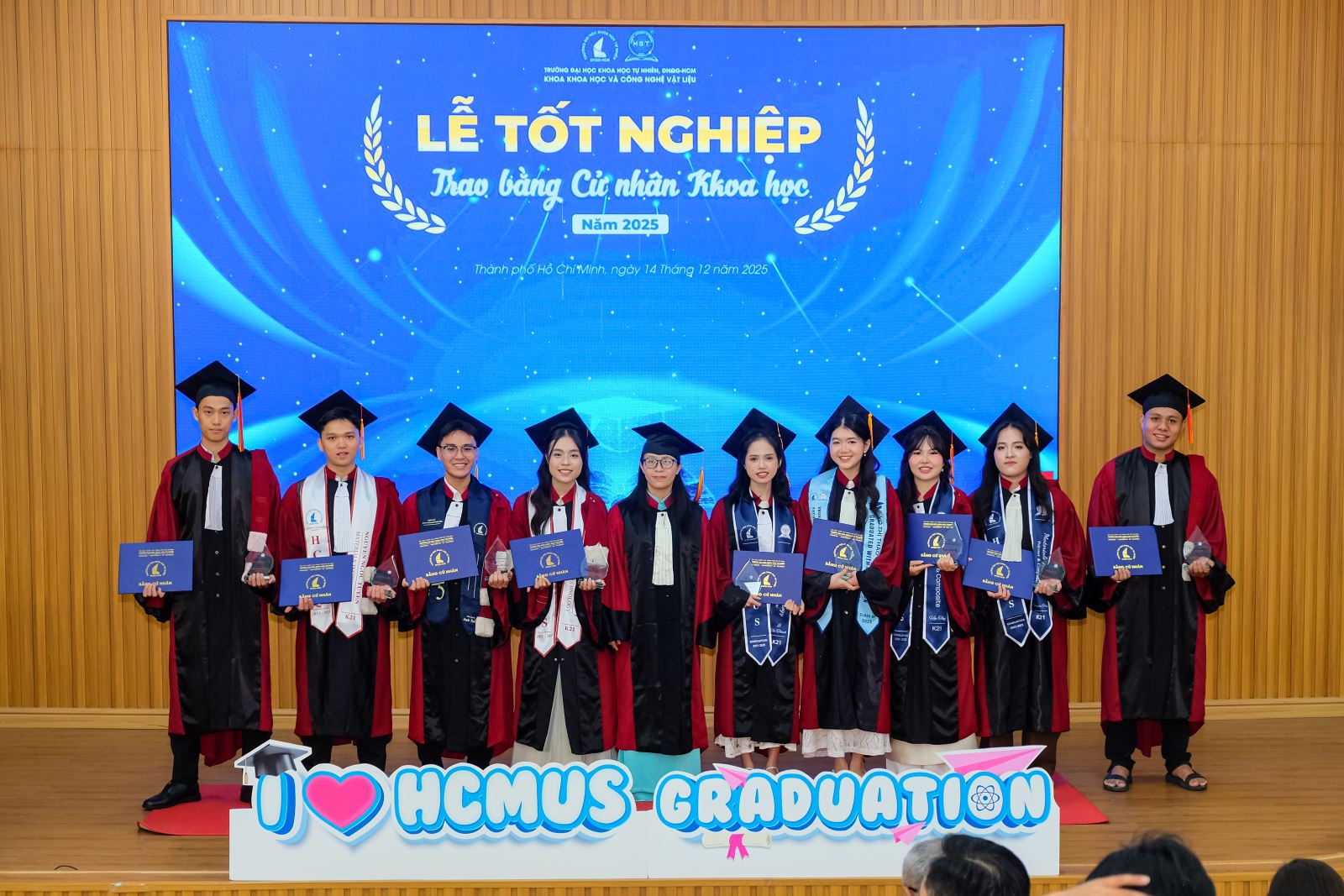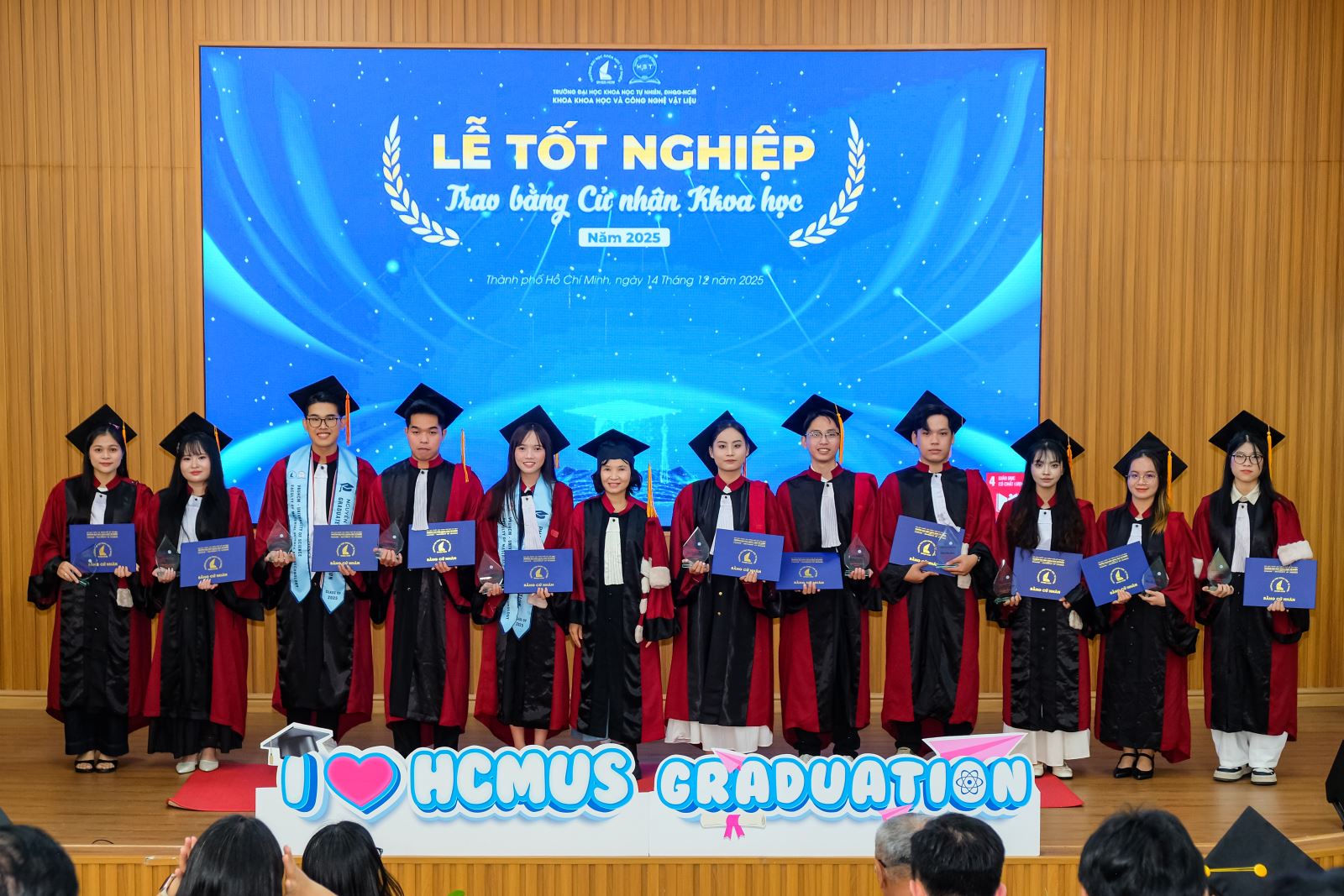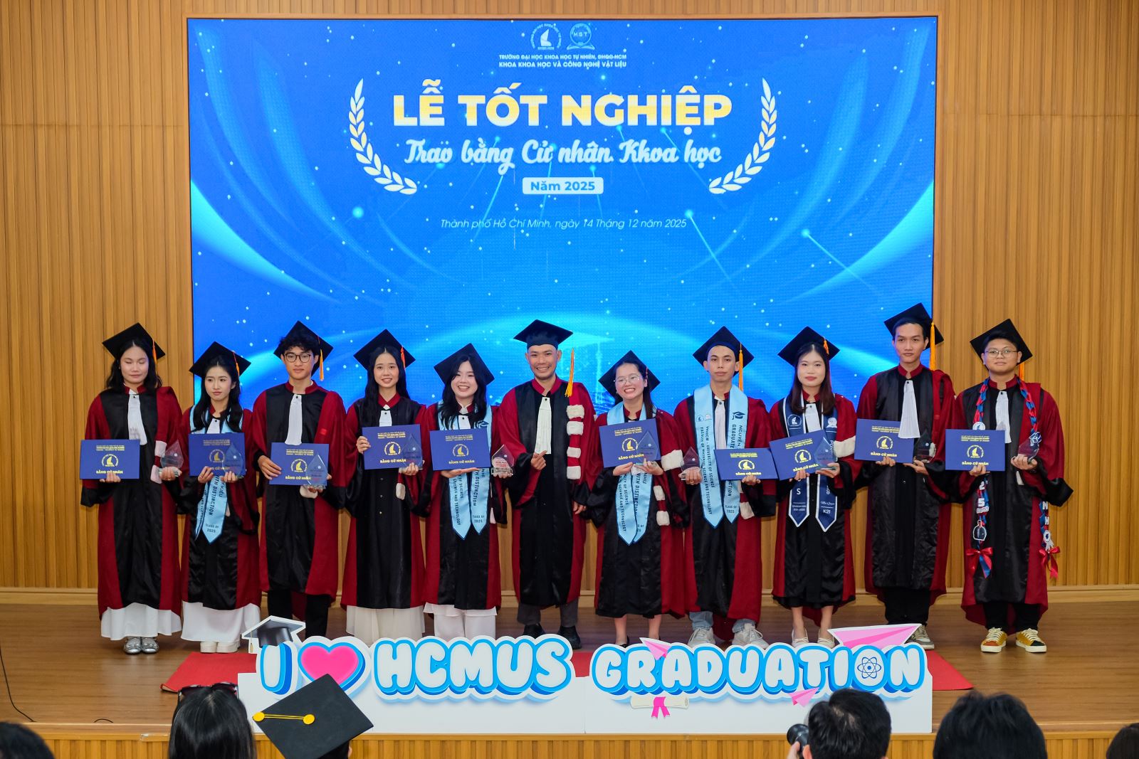 Sáng ngày 14/12/2025, Khoa Khoa học và Công nghệ Vật liệu (KH&CNVL), Trường ĐH Khoa học tự nhiên, ĐHQG-HCM đã long trọng tổ chức Lễ tốt nghiệp cho các sinh viên khóa 2021–2025, đánh dấu cột mốc trưởng thành đầy tự hào của các Tân Cử nhân ngành Khoa học Vật liệu và ngành Công nghệ Vật liệu. Đây là thành quả xứng đáng cho một hành trình bền bỉ của sự nỗ lực, kiên trì học tập, miệt mài trong giảng đường và phòng thí nghiệm, cùng sự đồng hành tận tâm của quý Thầy Cô trong suốt những năm tháng đại học.