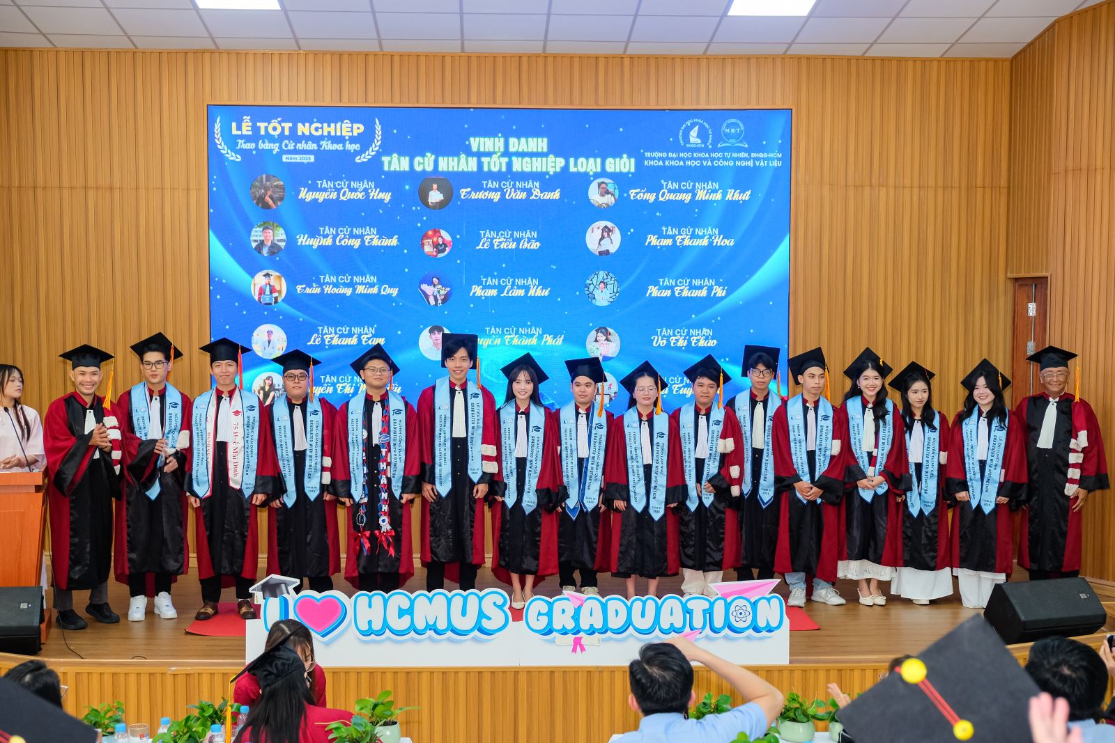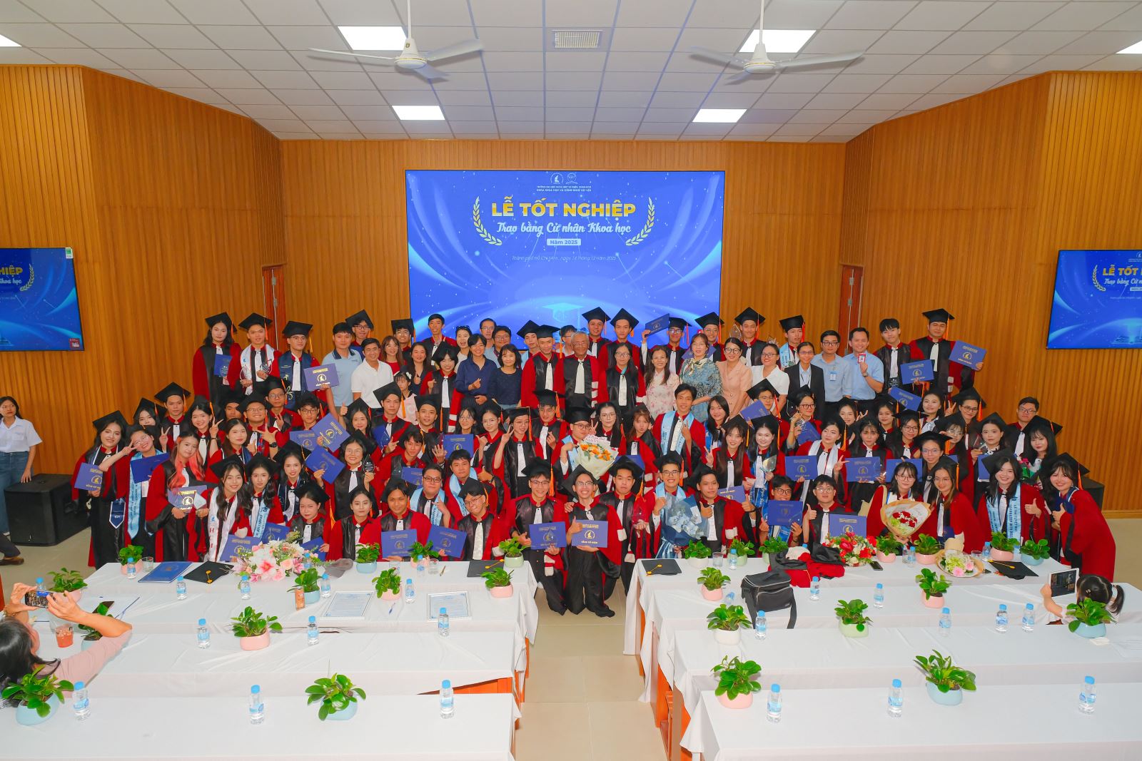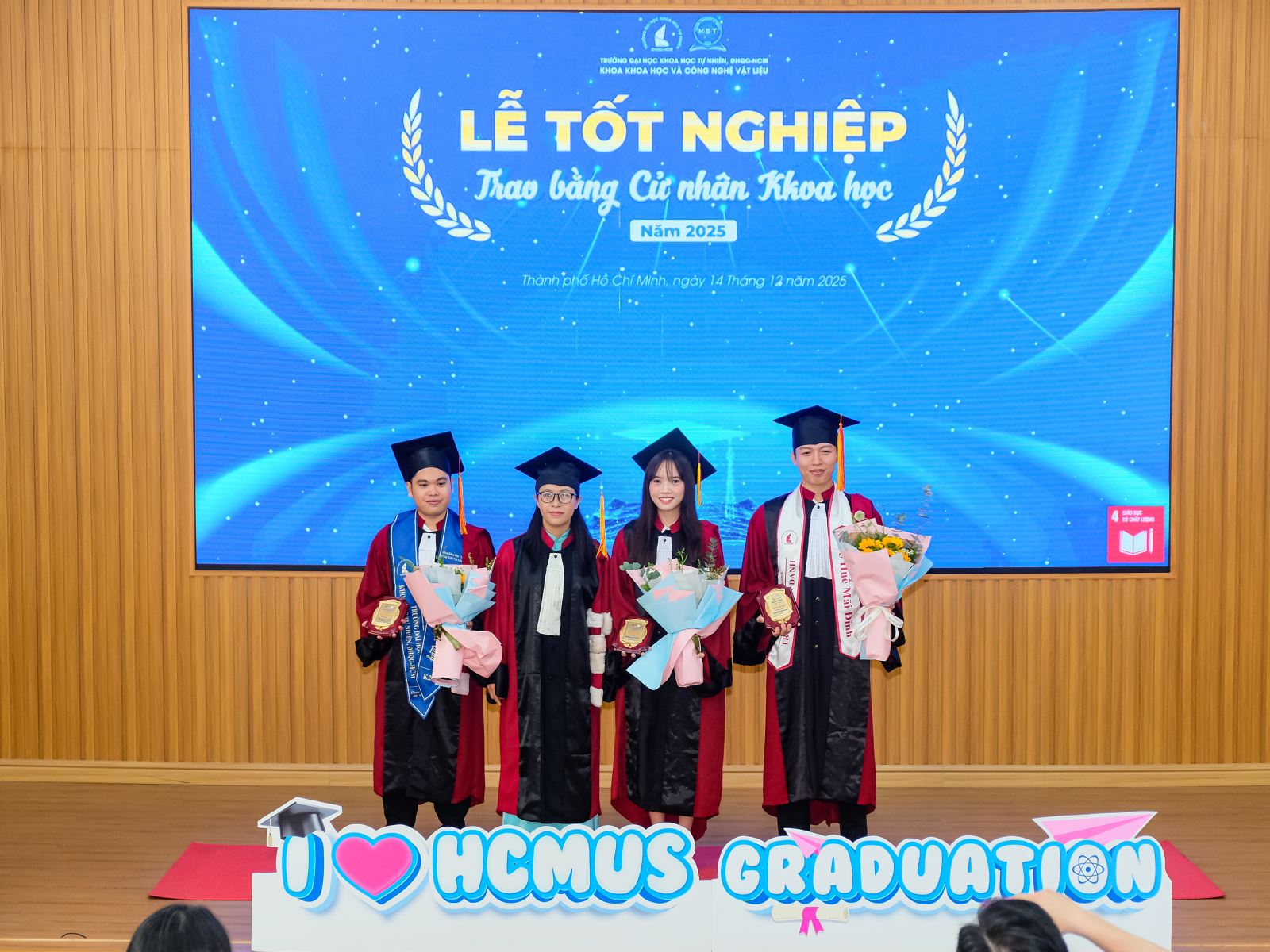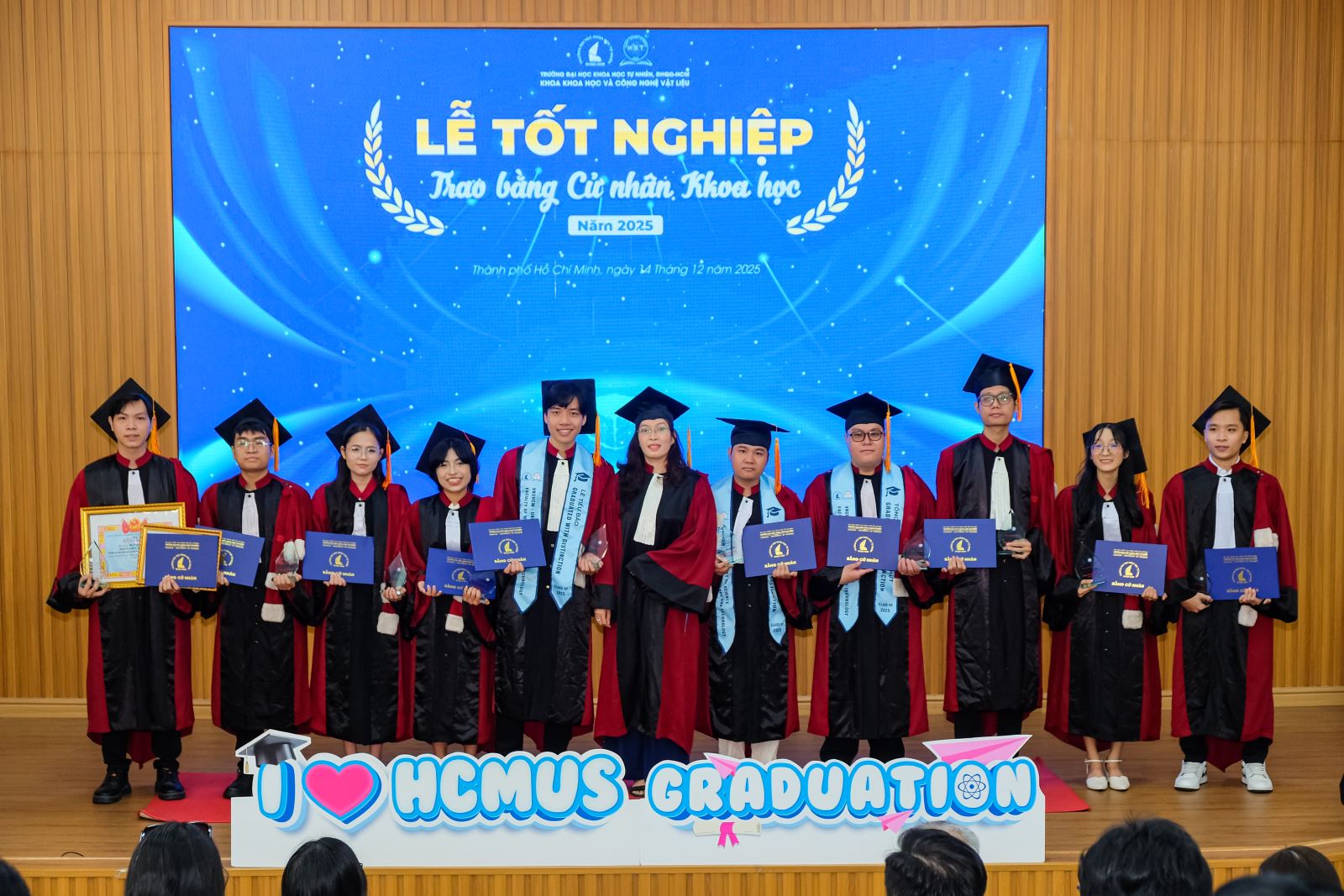 Sáng ngày 14/12/2025, Khoa Khoa học và Công nghệ Vật liệu (KH&CNVL), Trường ĐH Khoa học tự nhiên, ĐHQG-HCM đã long trọng tổ chức Lễ tốt nghiệp cho các sinh viên khóa 2021–2025, đánh dấu cột mốc trưởng thành đầy tự hào của các Tân Cử nhân ngành Khoa học Vật liệu và ngành Công nghệ Vật liệu. Đây là thành quả xứng đáng cho một hành trình bền bỉ của sự nỗ lực, kiên trì học tập, miệt mài trong giảng đường và phòng thí nghiệm, cùng sự đồng hành tận tâm của quý Thầy Cô trong suốt những năm tháng đại học.